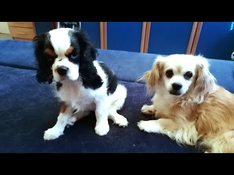 Cavalier King Charles LARS - older sister Lina teaches him how to behave...
